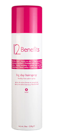 12 Benefits Big Day Hairspray is infused with vitamin B5, vitamin E enriched argan oil and luxurious silk. Our special ingredients combine to add natural volume, protect cuticles, improve styling, and leave hair very touchable. Flexibly firm support + Quick to dry + Heat protecting + Oil and protein fortified + Provides style memory + Shine enhancing + Resists humidity + Leaves hair touchable + Voluminous finish + Never sticky + Light scent + Brushable
